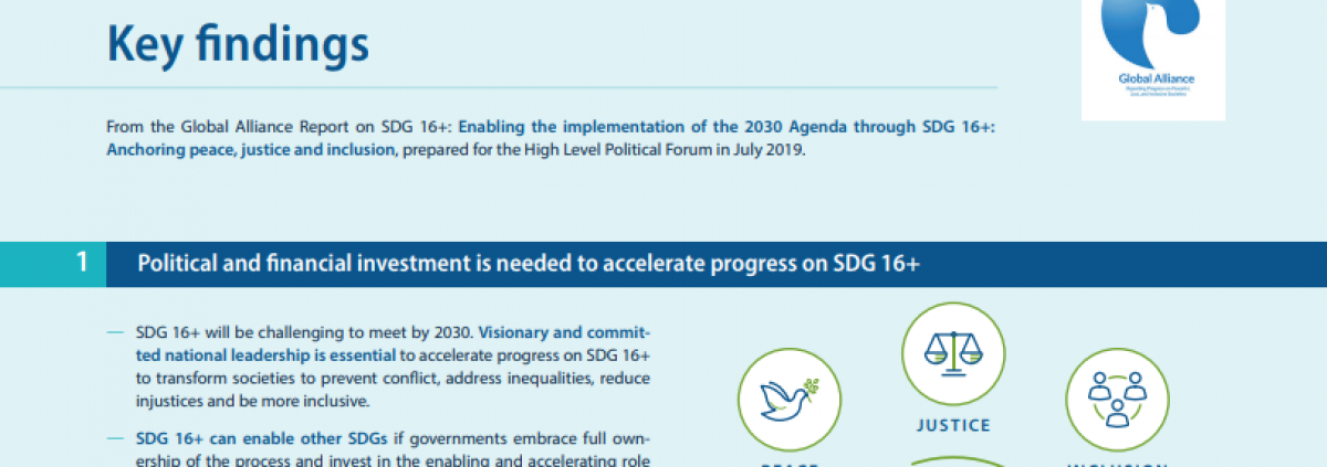Three key findings drawn from the preliminary SDG 16+ Report of the Global Alliance. This report was prepared for the HLPF in July 2019, and is informed by a series of global and regional consultations on SDG 16+, documented case studies of SDG 16+ implementation and a review of recent studies.
