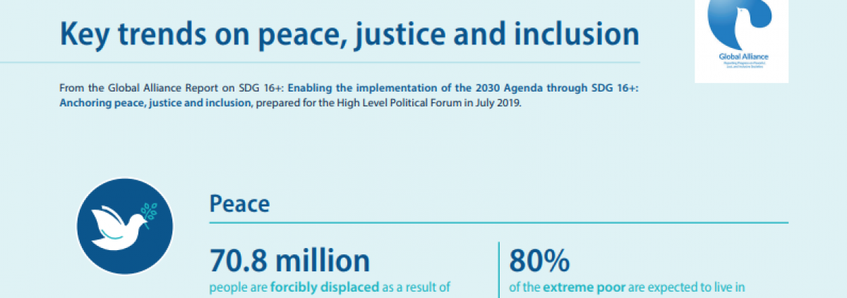 Key trends drawn from the Global Alliance’s preliminary SDG 16+ Report. This report was prepared for the HLPF in July 2019, and is informed by a series of global and regional consultations on SDG 16+, documented case studies of SDG 16+ implementation and a review of recent studies.