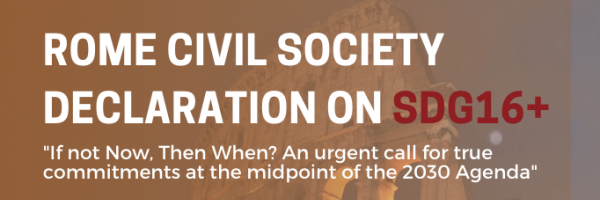 In 2019, SDG16 was reviewed for the first time at the UN High-Level Political Forum 2019 (HPLF), marking the need for civil society to come together in order to update on the (lack of) progress towards the achievement of SDG16 and to share recommendations in the 2019 Rome Civil Society Declaration on SDG16+. The 2019 Declaration “Amplified Commitments and Partnerships for Accelerated Action: Rome Civil Society Declaration on SDG16+” received endorsement from over 130 civil society organizations and networks. As SDG16 was reviewed for the second time at UN HPLF 2021, the Rome Declaration was revisited in 2021. The Rome Declaration 2.0 “A Renewed Call for Strengthening Commitments, Partnerships, and Accelerated Action for SDG16+” was endorsed by 215+ civil society stakeholders, and looked specifically at the impacts of COVID-19 on the promotion of just, peaceful and inclusive societies. In 2022, The Rome Declaration, “SDG16+ in Peril: An urgent call-to-action for safeguarding commitments to Peaceful, Just and Inclusive Societies” was endorsed by over 130 civil society organizations. The Rome Declaration was further expanded upon through the 2023 “Rome Declaration on SDG16+: An urgent call for transformative SDG16+ commitments at the midpoint of the 2030 Agenda“.