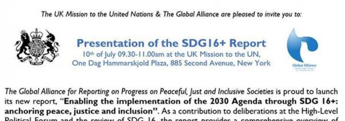 During the event, the report’s key findings, as well as trends on peace, justice and inclusion will be presented to select invitees from Permanent Missions, Global Alliance partners and countries supportive of the SDG 16 agenda. Presentations will provide examples from the report’s 25 case studies on SDG 16 implementation and key recommendations on the way forward for SDG 16+.